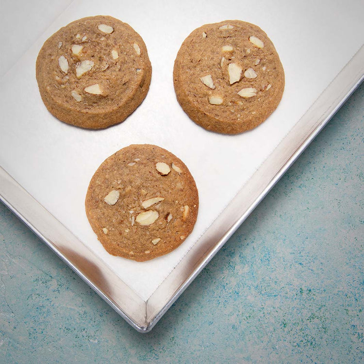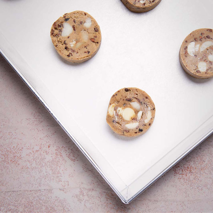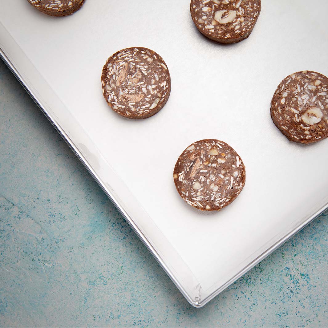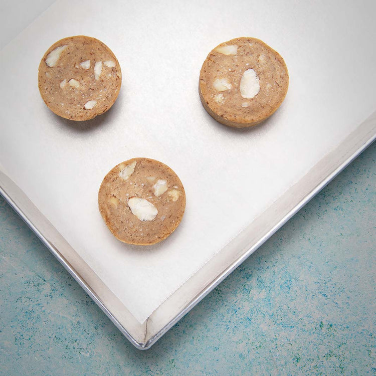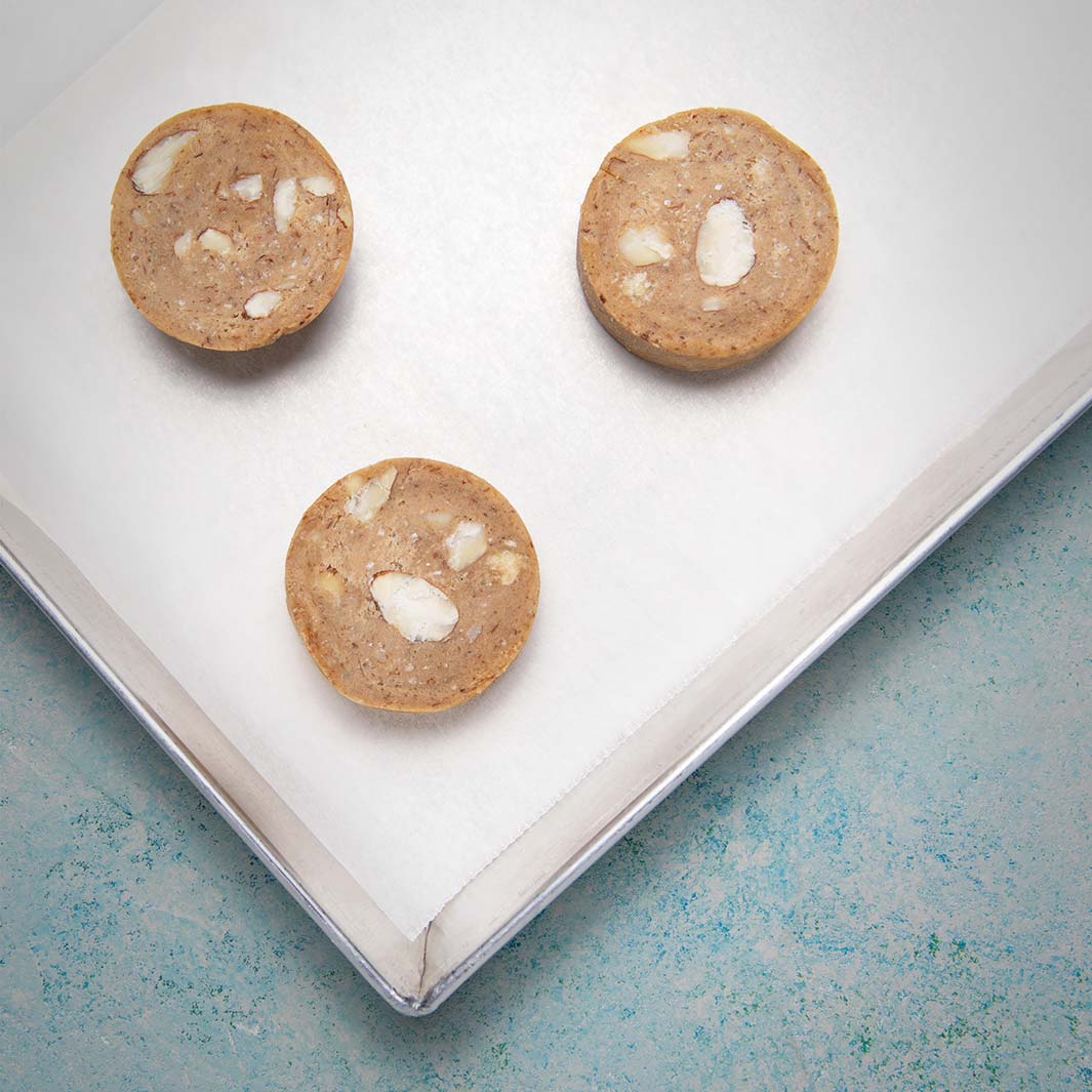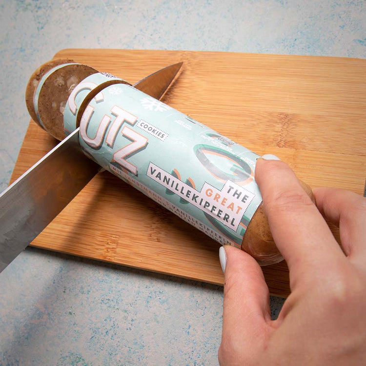 Für ein optimales Ergebnis schneidest Du vom noch gefrorenen Teig mit einem glatten Küchenmesser (kein Wellenschliff) 1cm breite Scheiben ab und befreist sie von der Verpackung. Auf keinen Fall zuvor antauen lassen, denn sonst kannst Du keine schönen Stücke mehr schneiden.